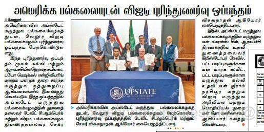 SUNY Upstate Medical University and VIT Vellore Forge Global Partnership in Health Sciences and Biomedical Research- The Hindu