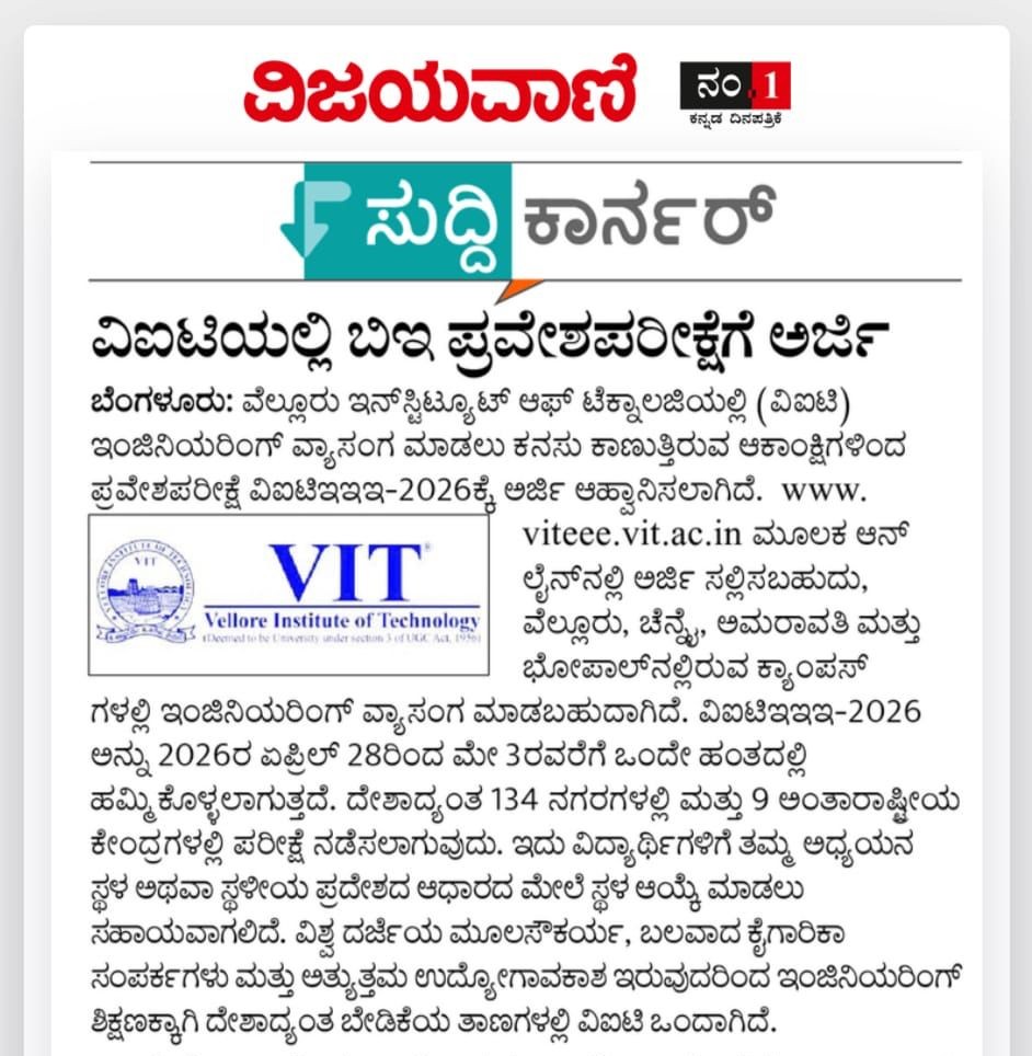 VIT opens applications for VIT Engineering Entrance Examination (VITEEE) 2026. Vijayavani- 27.10.2025